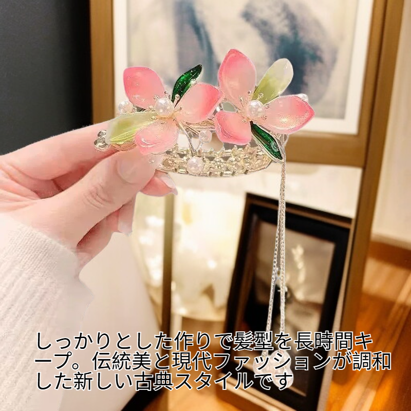 ● 古風デザインと桃の花モチーフが融合した、華やかで上品なヘアピン。普段使いから特別な日まで幅広く活躍します。